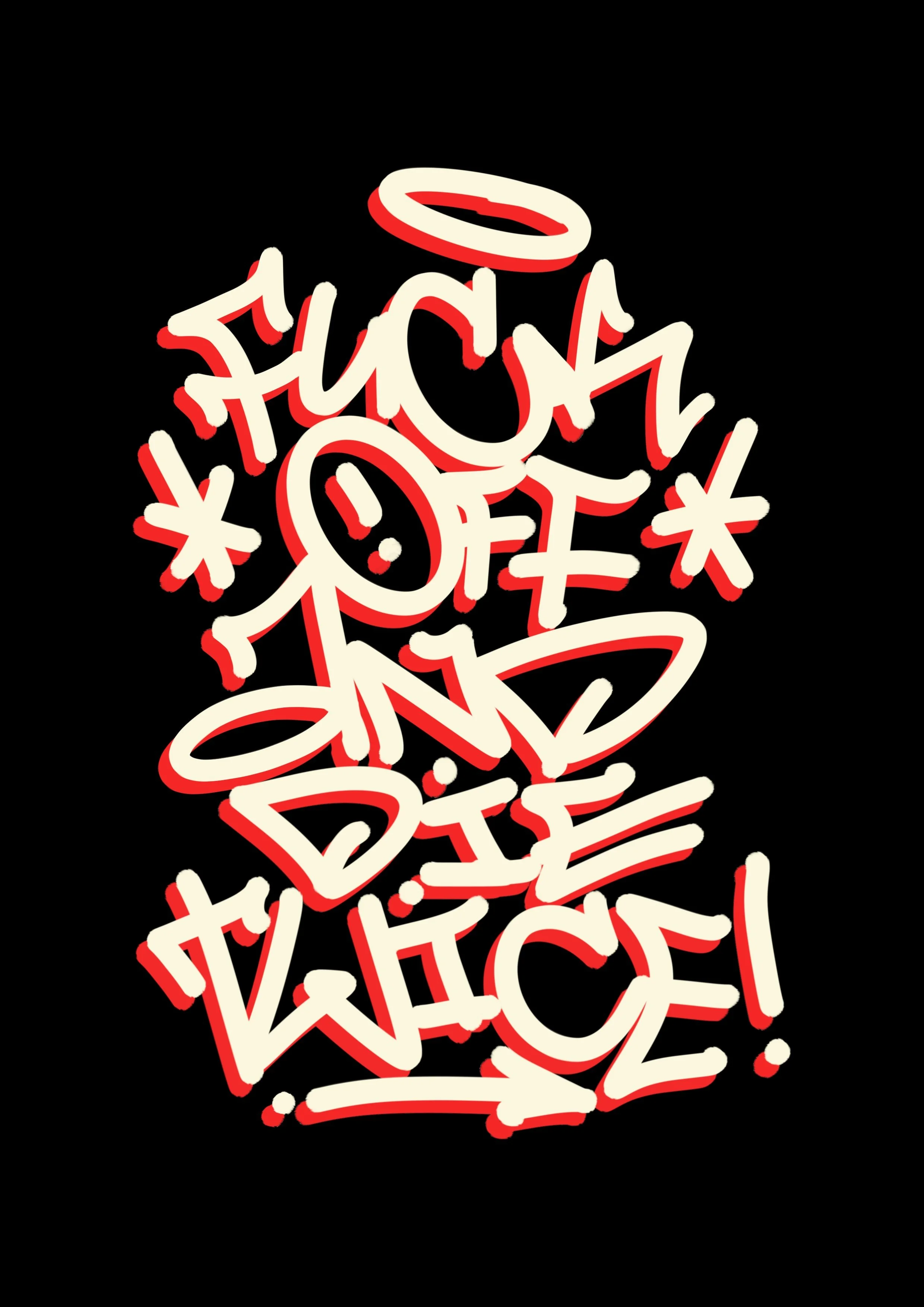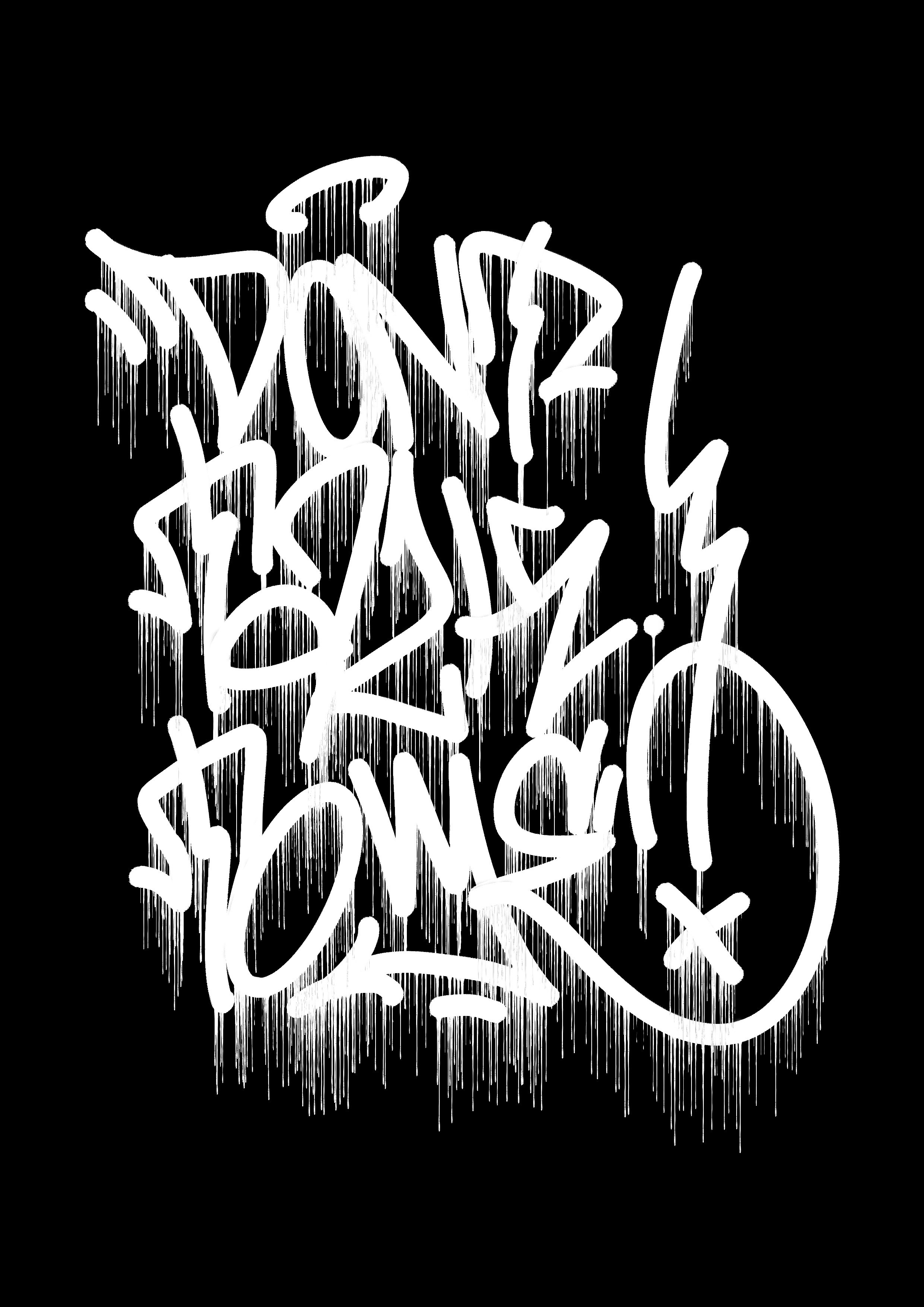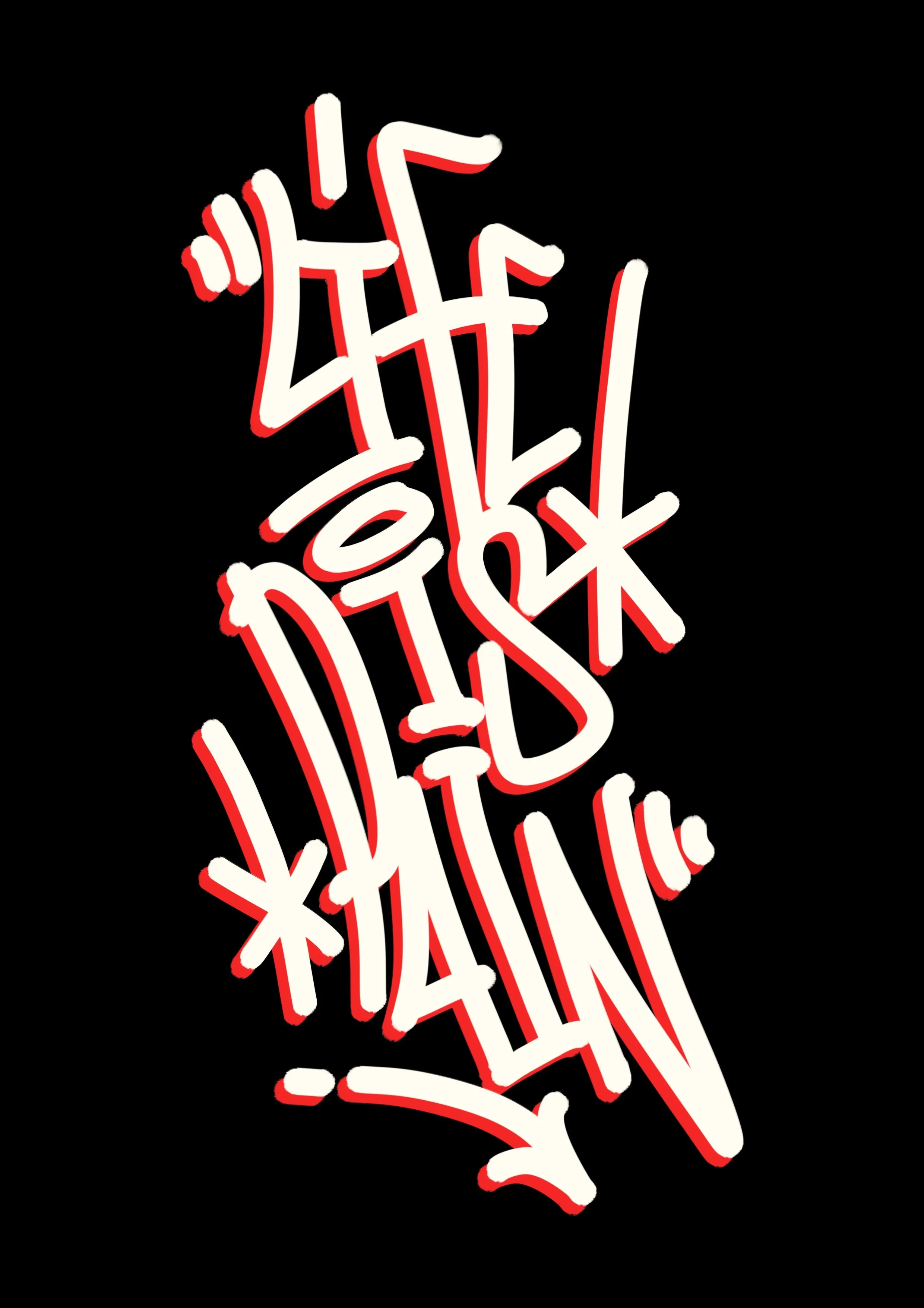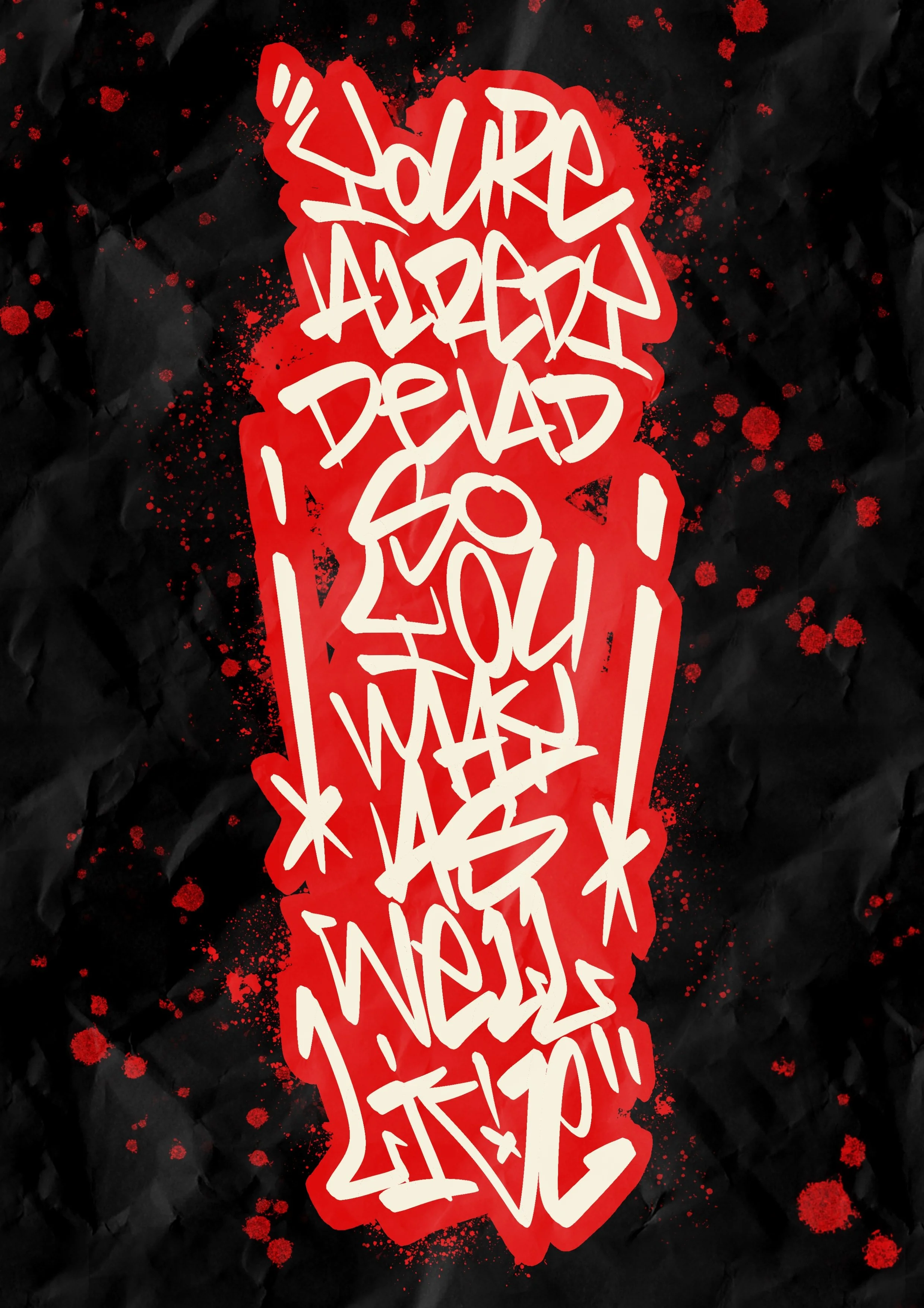 Words that hit different. Whether it’s something Sleven’s penned from his chaotic depths or borrowed from the wise and twisted, this section celebrates the power of letters when they’re dressed to kill. From drippy tags & chiselled calligraphy to bubble gum fonts & hip-hop hieroglyphs, every piece fuses meaning with visual flair. Some stand loud and proud, others creep in subtle, backed by scenes, faces, or moods that match the message. Truth, humour, rage or peace, whatever the flavour, it’s all written with style and soul.