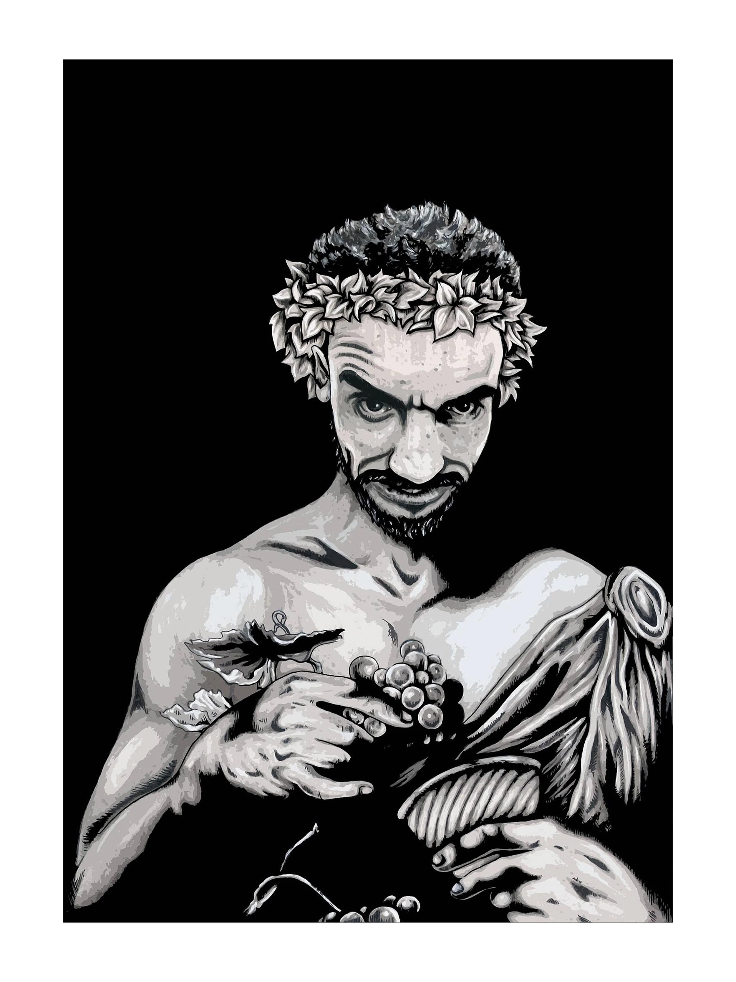 Ink and alcohol marker portrait, on A3 paper, of theatre actor Winston Pyke as Dionysus. The piece was then edited on photoshop and sent off to be used for poster promotion in the play he was playing the character in.