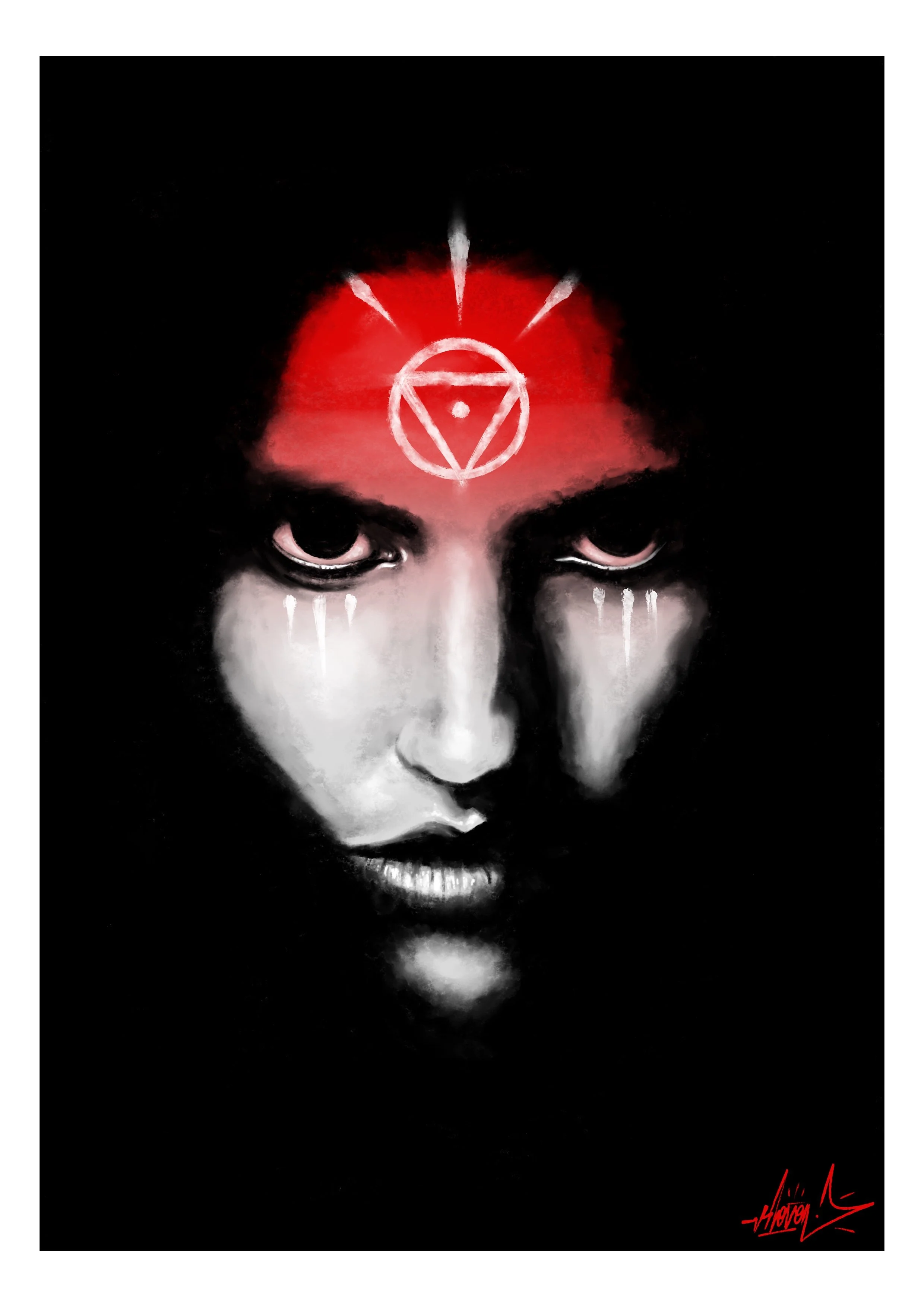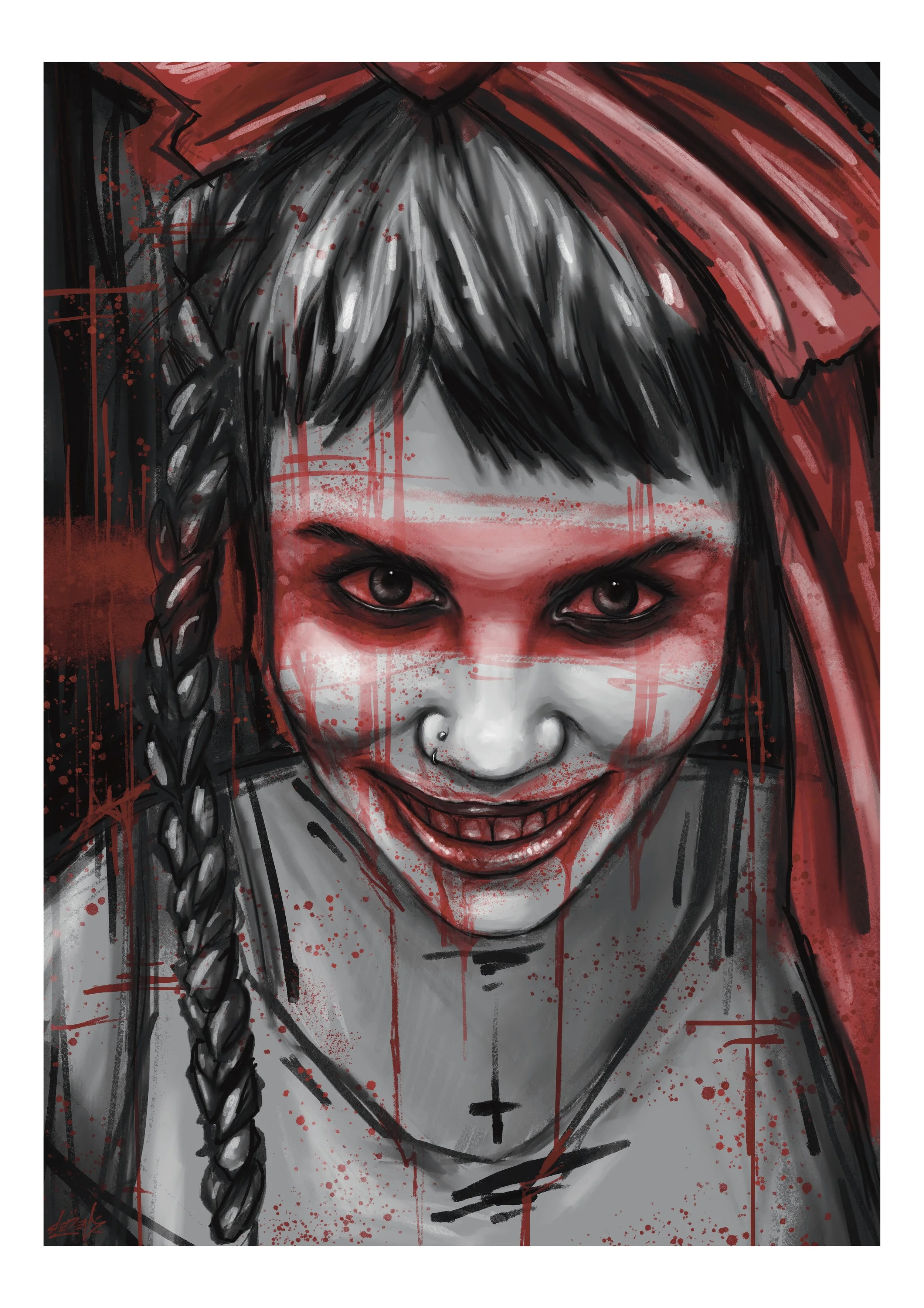 One hour and ten minute digital portrait study of some whimsically witchy looking lady found on Pinterest. The original was just a black n white photo, I added the red and and white markings for extra 60s horror witchy vibes.