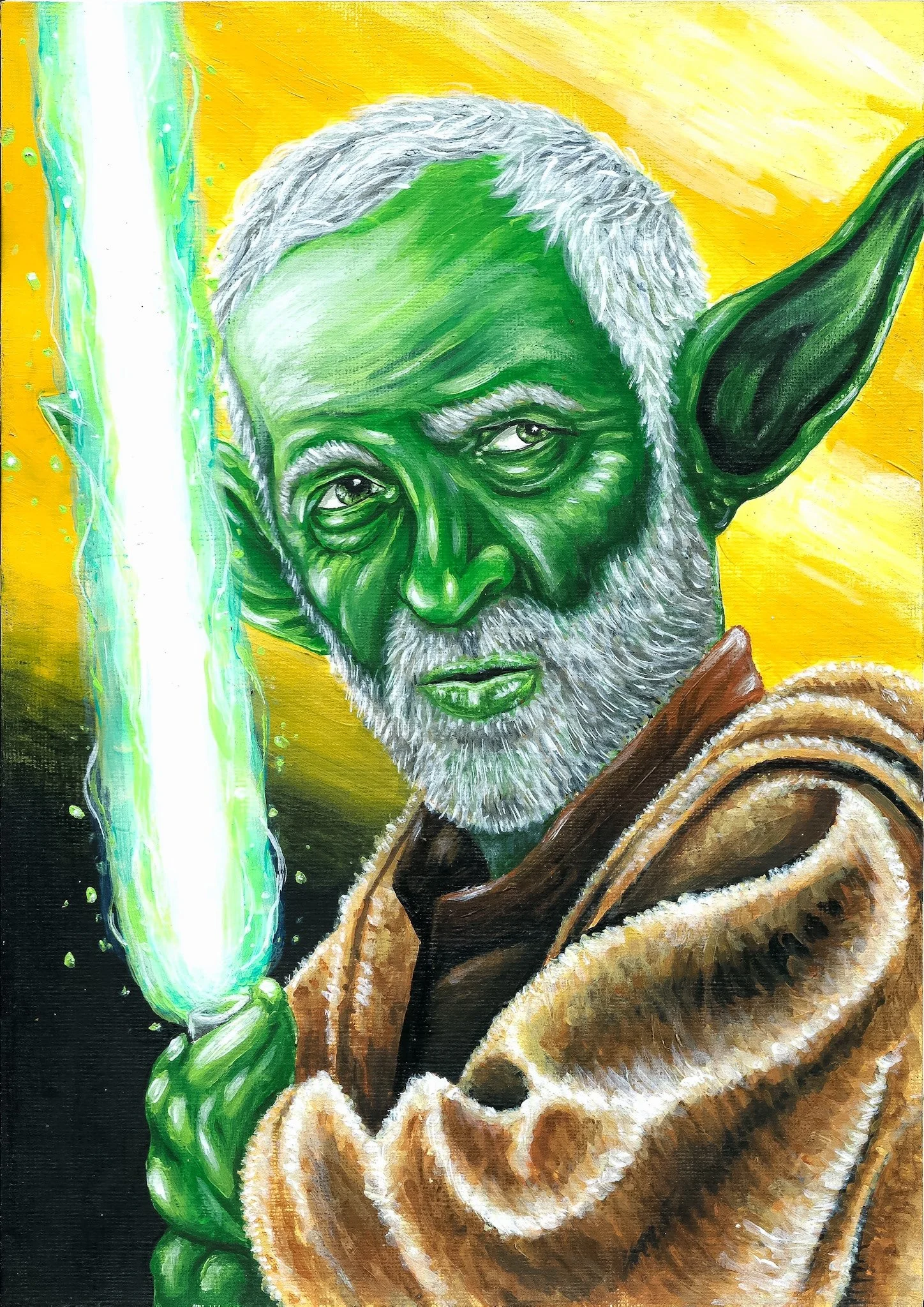 Acrylic painting, on A4 paper, of Jeremy Corbyn as Yoda from Star Wars. Painted for a May the 4th Star Wars exhibition, held at the Matchbox Gallery back in 2017. during the year this and the Theresa Emperor piece were painted, both politicians were up for election against each other and it truly felt like a classic battle of good vs evil and a pairing of such fictional characters, as yoda battling the emperor, represented the political tension perfectly.