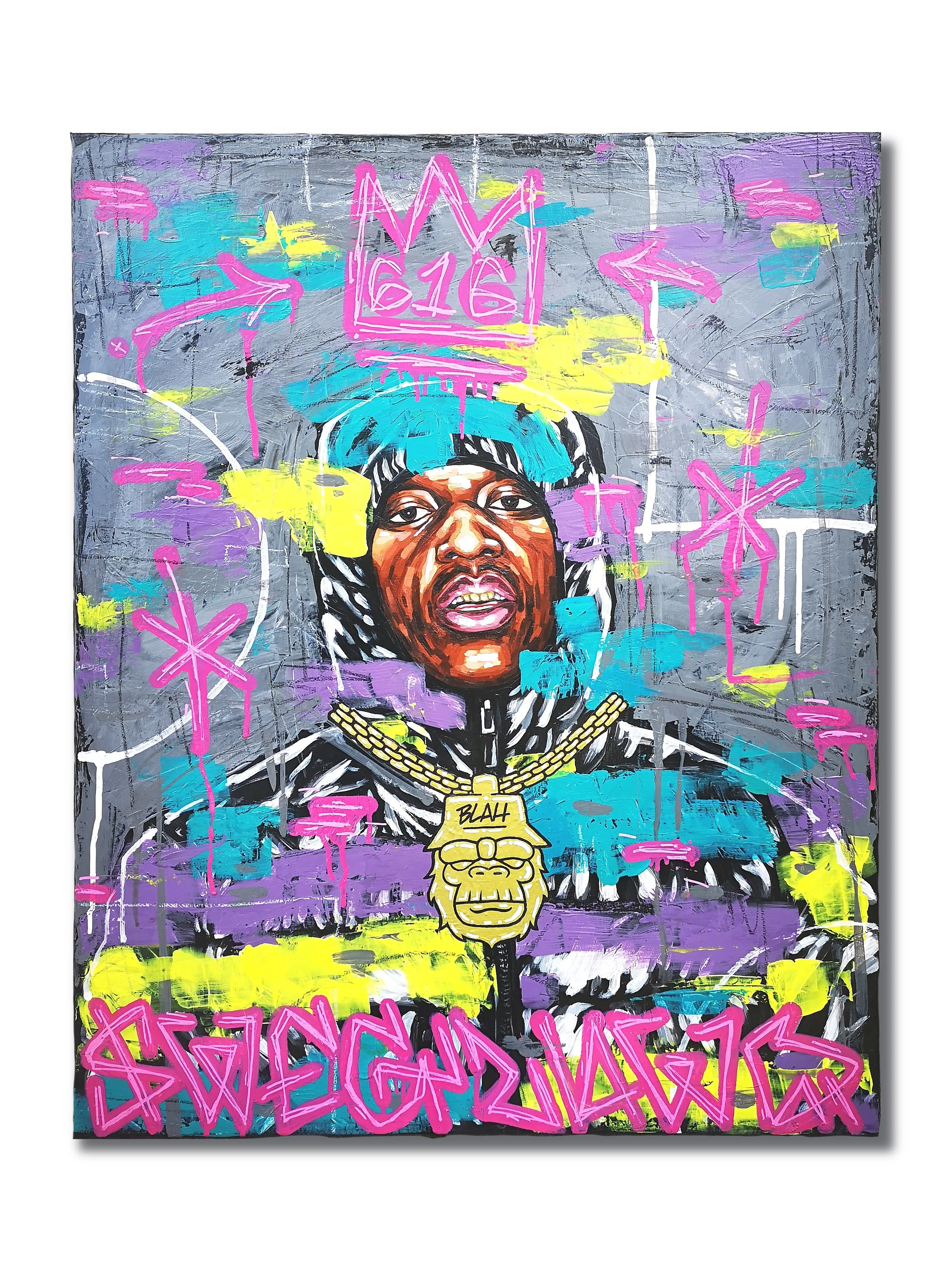 Painting of the SWEG LAWD Black Josh, on canvas. This was painted for an event that Black josh was performing at. It started out with the intention of the face being more realistic but that ended up going down more of a expressionistic path. The markings were planned, as well as markings like these can be planned. A graffiti writing mop was used to create the letters, crown, stars, arrows & dashes. And the cartoon chain, with his ape mascot and BLAH records logo on it, finish off the piece.