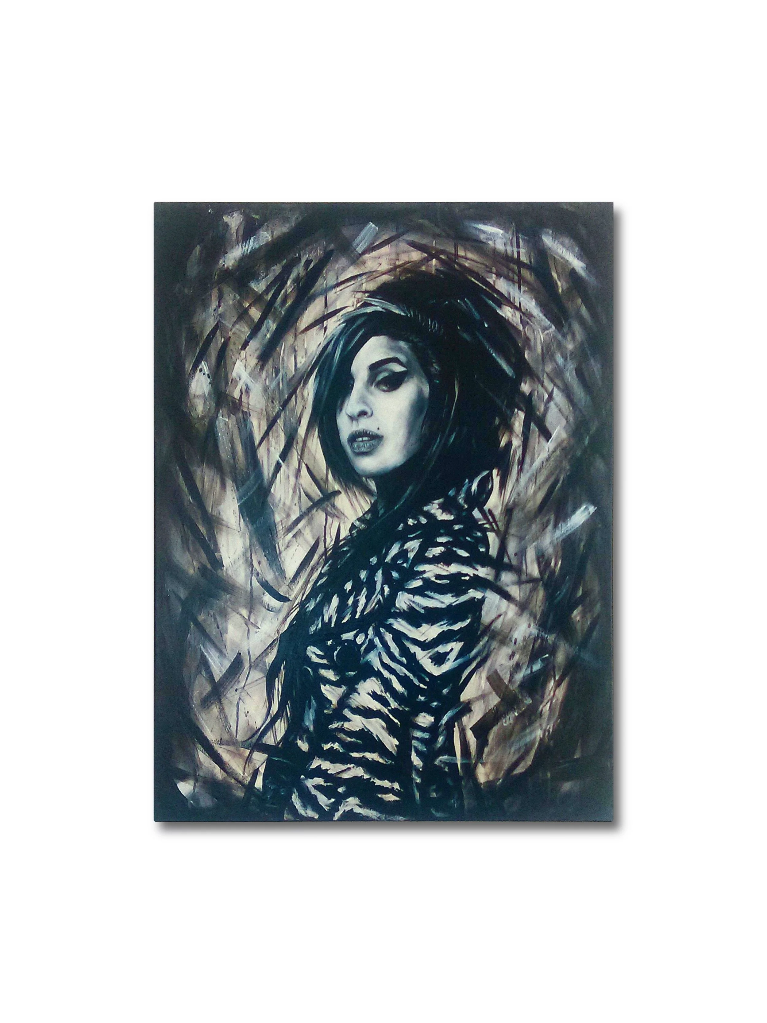 Acrylic on canvas portrait of Amy Winehouse, for a private collector. Sleven really loved painting this, being able to carry that zebra print into the background with such loose and freeing brush strokes. Really adds depth to the piece and bring focus to Amy in the centre.