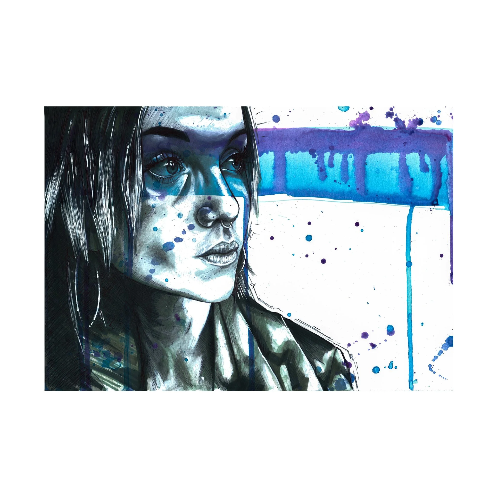 Biro, pencil and water colour on A4. The original reference of this was a colour photo, choice of not doing this in colour and then adding the streaks of watercolour over the eyes draws attention to the tense, pensive melancholy in her eyes. And in turn enhances them emotions.