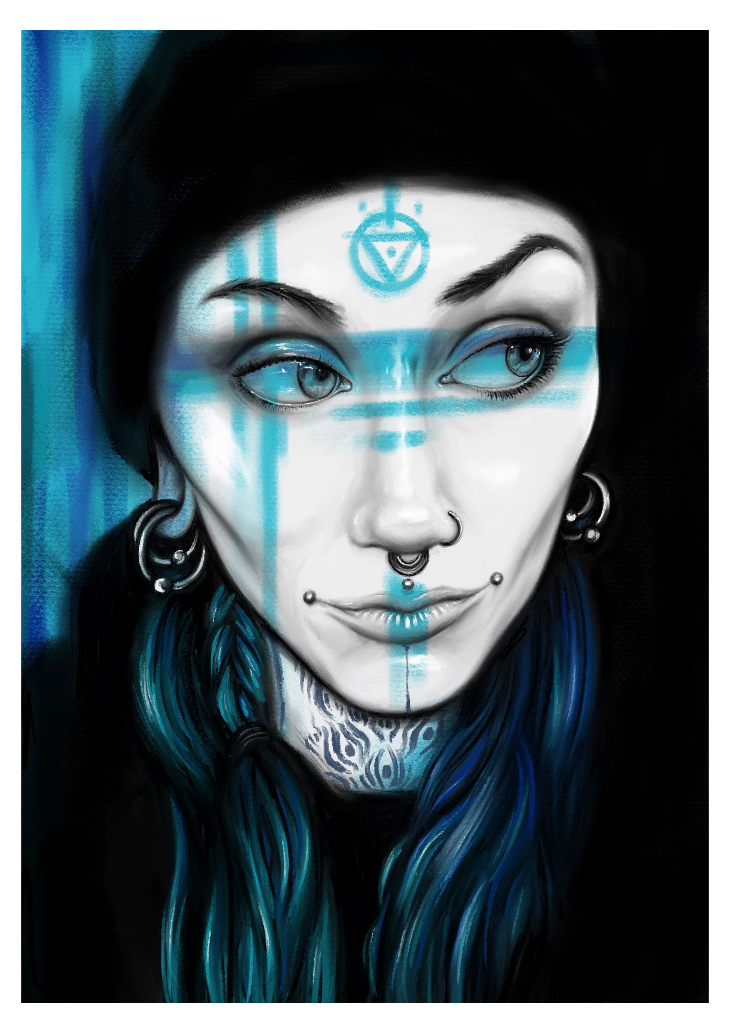 Three hours and fifty nine minute digital study of model Core Suicide. Again, this was turned into a black and grey piece, to emphasise the colour in here eyes and hair, which happened to match the colour of her eyes. Adding the war paint marking added to accentuating her striking cheek bones and cat like eyes.