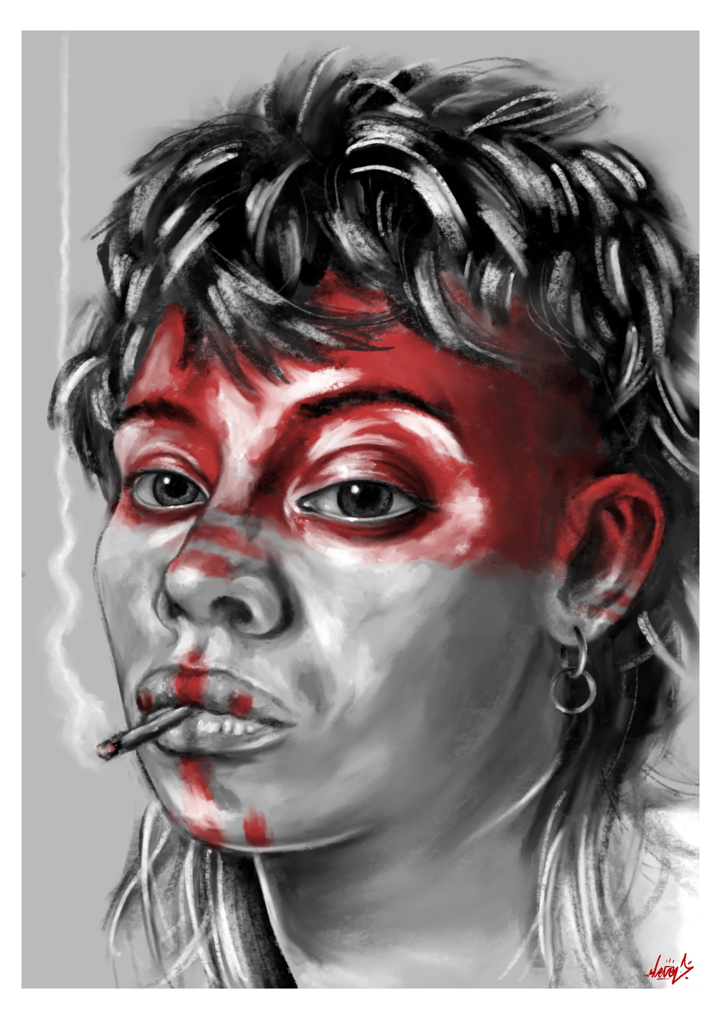 Two hour and forty seven minute digital portrait study of a post apocalyptic, zoot chuffin swamp princess named Deva. Original photo was in colour. I like turning portraits into monochromatic tones so I can add a splash of one bold colour, usually red, in the form of some kind tribal war paint.