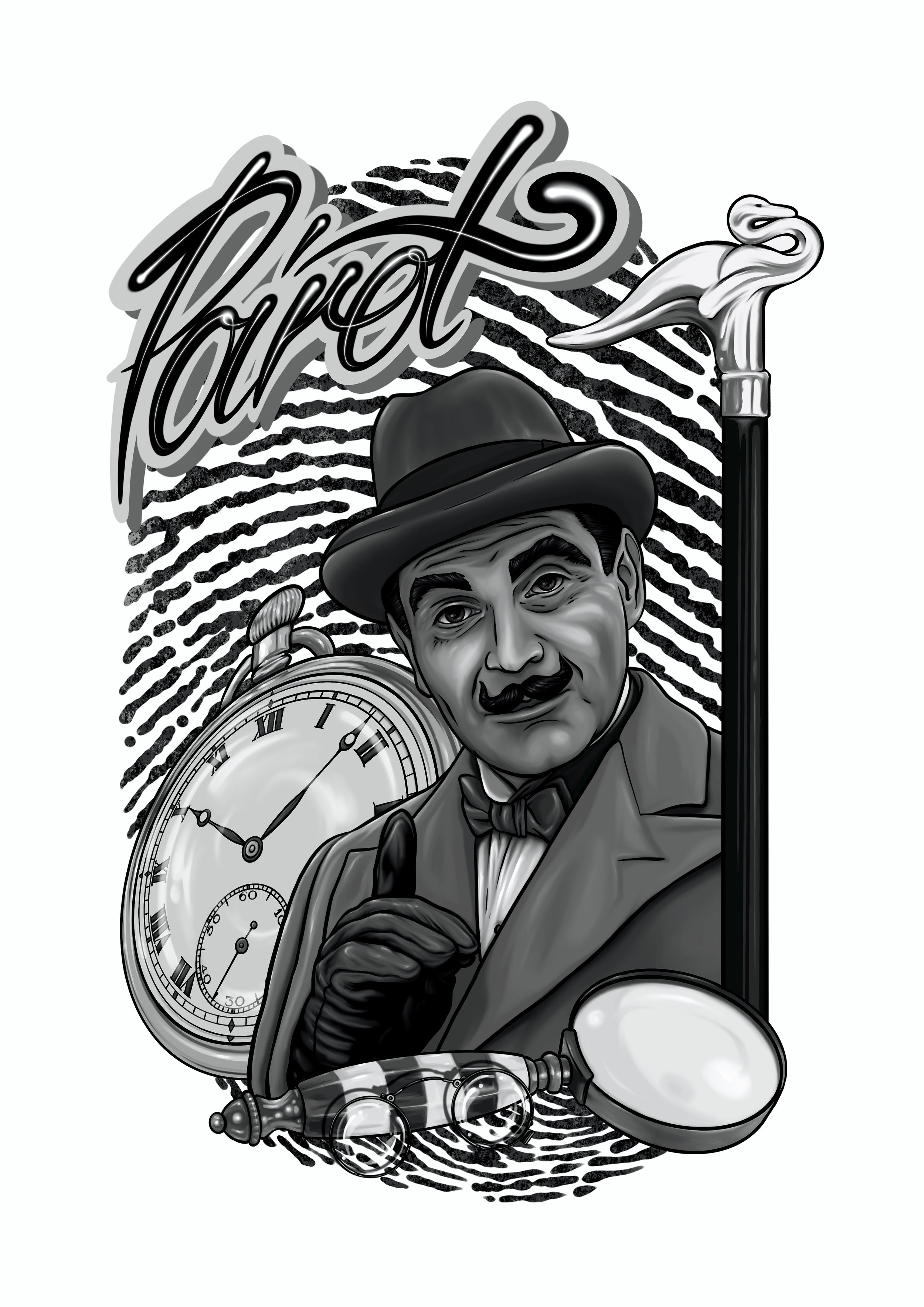 Twelve hour and thirty nine minute digital piece of David Suchet as Inspector Poirot. The piece utilises the main physical objects Poirot is easily recognised for, such as his pocket watch, cane, armless spectacles and magnifying glass. With some nice stylised cursive script and the finger print in the background, that notes his work as a detective, brings the piece together as a whole.