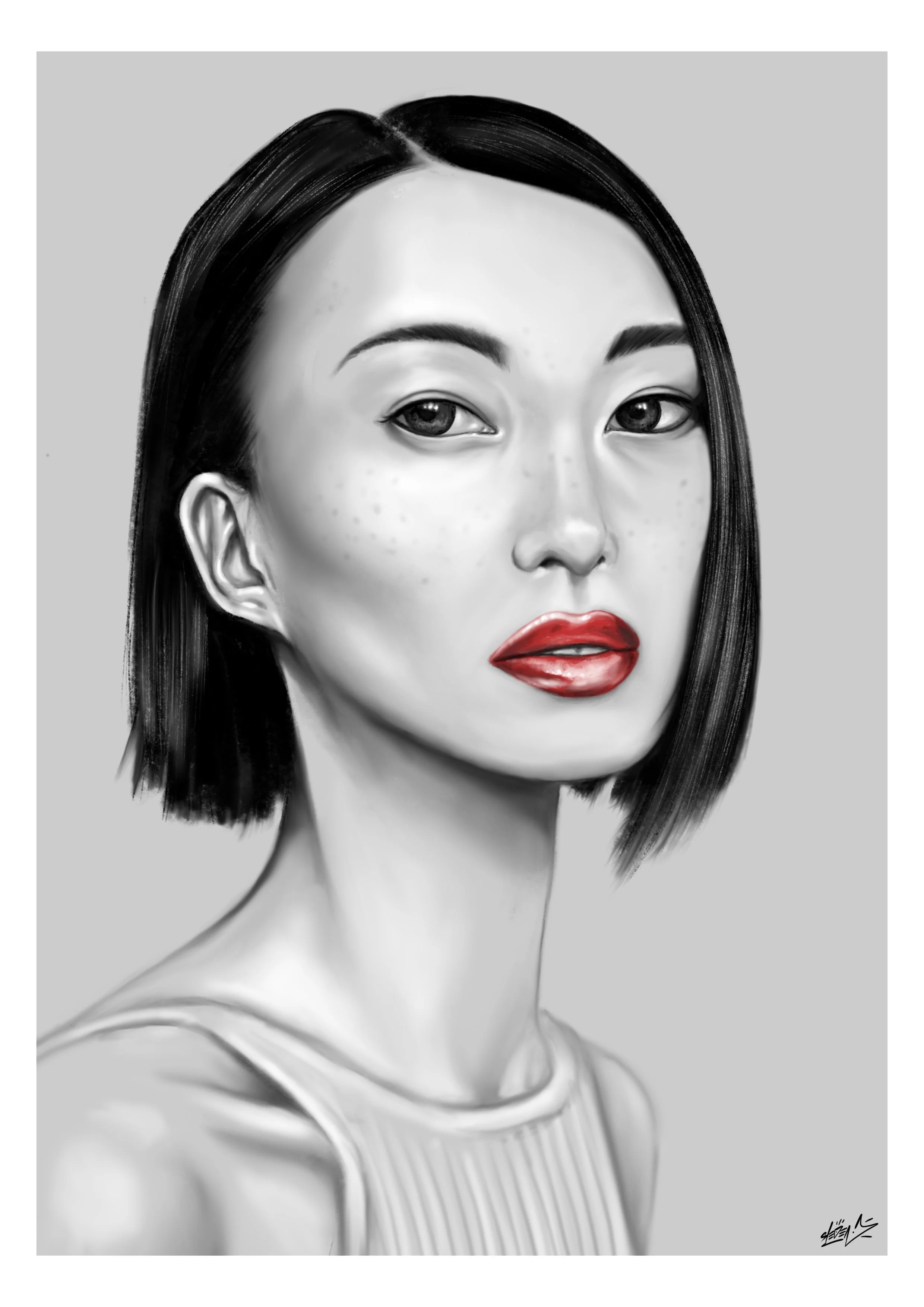 Four hour and thirty eight minute digital portrait study of Mariya Mamoto. Original photo was in colour. This was turned into a black n grey to emphasise the red lipstick she's wearing in the picture. It was a difficult one to draw as Mariya has such striking features that mange to be soft, yet chiselled and all perfectly balanced. So nothing drawn could possibly come as close to how uniquely stunning her face is.